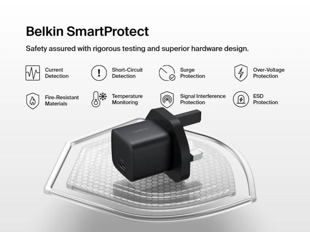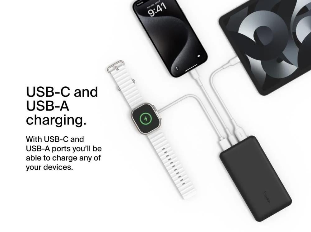 - ثلاثة منافذ شحن (USB-C بقوة 15 واط + منفذين USB-A بقوة 25واط) لشحن أكثر من جهاز في نفس الوقت.