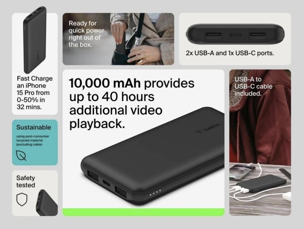 باقة BoostCharge Power Bundle من بيلكن هي رفيقك المثالي للبقاء على اتصال طوال اليوم. تضم باور بانك قوي، كابل عملي، وحقيبة سفر أنيقة تساعدك على تنظيم كل احتياجاتك من الشحن أثناء التنقل.
